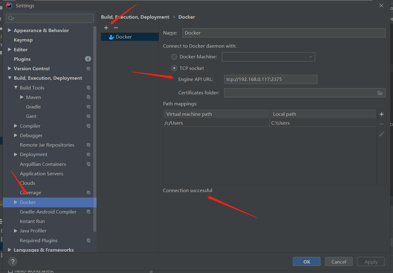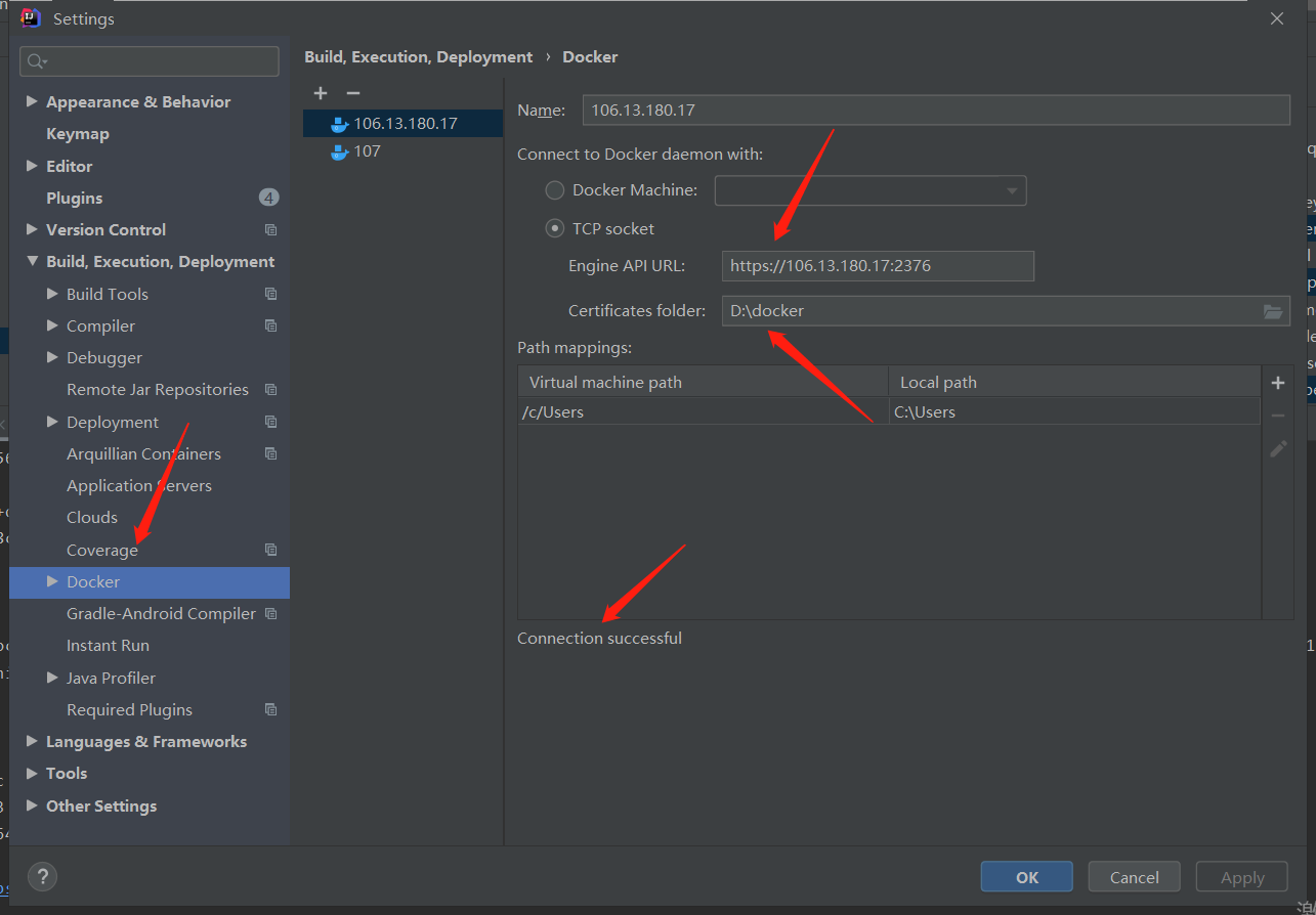 如果 docker 远程连接采用 TLS 连接,那么首先将服务器的ca.pem、cert.pem和key.pem三个文件下载到本地D:\docker目录,然后如图设置 docker 连接;