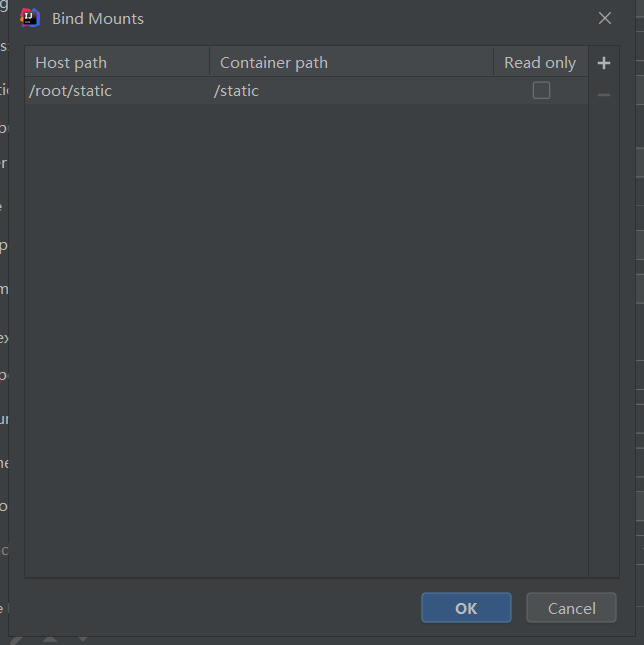 通常需要挂载“项目配置”、“静态资源”和“服务日志”几个目录,通过 idea 也能很方便的操作,通过上图中的Bind mounts设置;