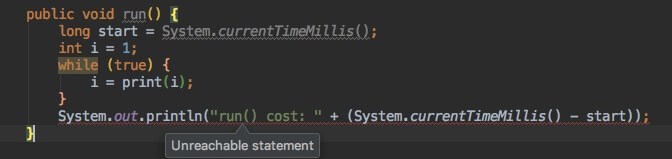 上面的提示很明显的告诉了,最后一行语句永远不可能达到,编译就存在异常了;那么问题来了,作为一个 java agent 的提供者,我哪知道使用者有没有写这种死循环的方法,如果应用中有这么个死循环的任务存在,把我的 agent 一挂载上去,导致应用都起不来,这个锅算谁的????