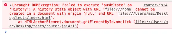 因为等一下要用到h5新增的pushState() 方法,因为这玩(diao)意(mao)太矫情了,不支持在本地的file协议运行,不然就会报以下错误