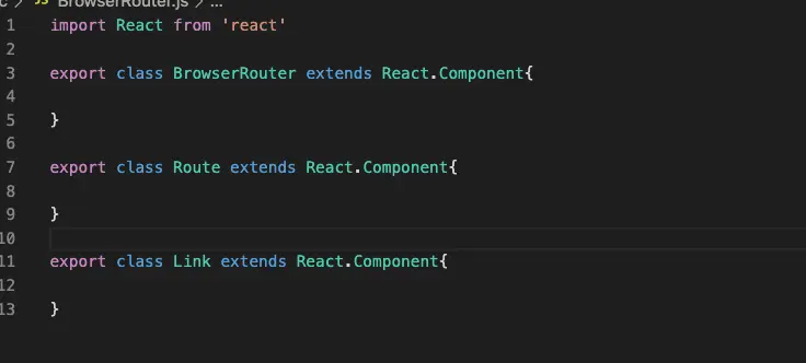 首先我们在index.js新建一个BrowserRouter.js文件,我们来实现自己BrowserRouter。 既然要实现BrowserRouter,那这个文件就得有三个组件BrowserRouter,Route,Link。