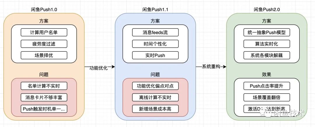 这些问题最终导致Push点击率无法继续提升,触碰到1.0方案的天花板。为了解决这些问题,我们对闲鱼Push系统进行几个方面的优化升级,并最终重构了闲鱼Push系统。