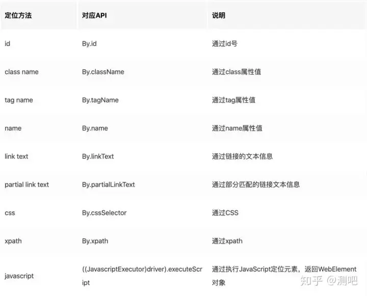 首先,我们需要认识元素。元素是可识别区分的属性。Selenium的WebDriver一共提供了九种定位方法,其中最常用的是前八种,先来看看在Java中的对应关系
