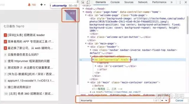 driver.findElement(By.cssSelector("#cornertip")); //CSS小技巧:我们可以在Chrome的开发者工具中Control+F搜索框中对我们要定位的元素进行搜索来确认定位是否正确,支持CSS和xpath,如上图所示