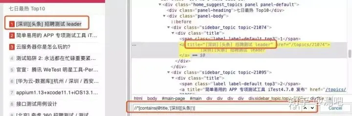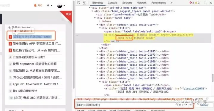 我们依旧来定位testerhome首页七日最热贴的首贴“[深圳][头条] 招聘测试 leader”,通过对DOM的分析可以看到title属性的内容就是帖子的标题,我们用此属性值的一部分来作为定位条件:
