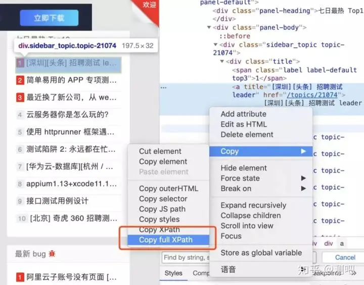 还是以定位一周内的最热门帖子为例,在Chrome浏览器的开发者工具栏中,找到要定位元素的HTML位置,右击会出现Copy full Xpath,点击它