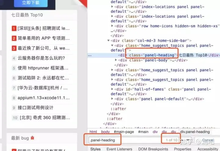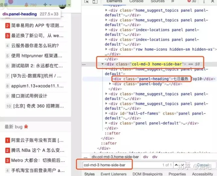 没错,出现了10个可被定位到的元素,因为有很多的标题都有相同的classname,并且没有其他如id,name等属性了;没办法了,我们就要往上找,我们发现往上2个div标签节点,classname为”col-md-3 home-side-bar“的标签节点是唯一的: