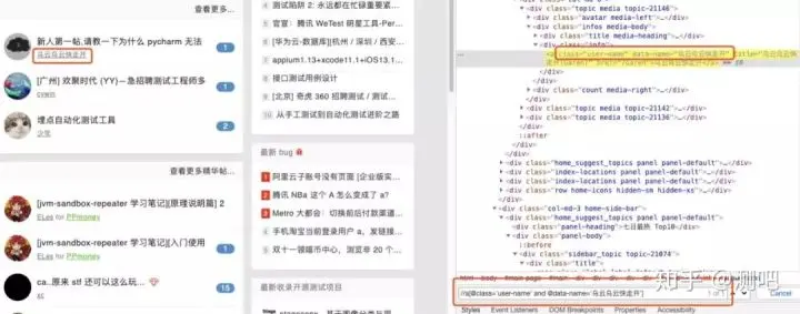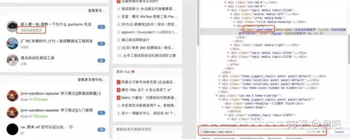 现在需要定位testhome社区首页一篇最新帖子的作者,作者名为“乌云乌云快走开” 如果我们只依靠className的话会发现有28个相同属性的元素,如下图: