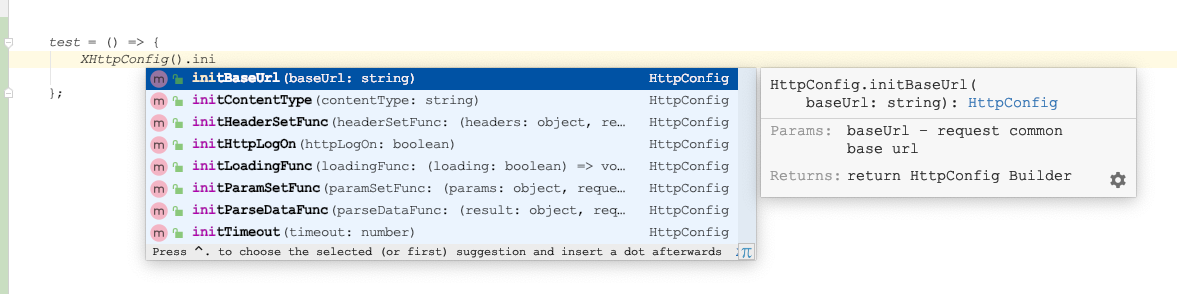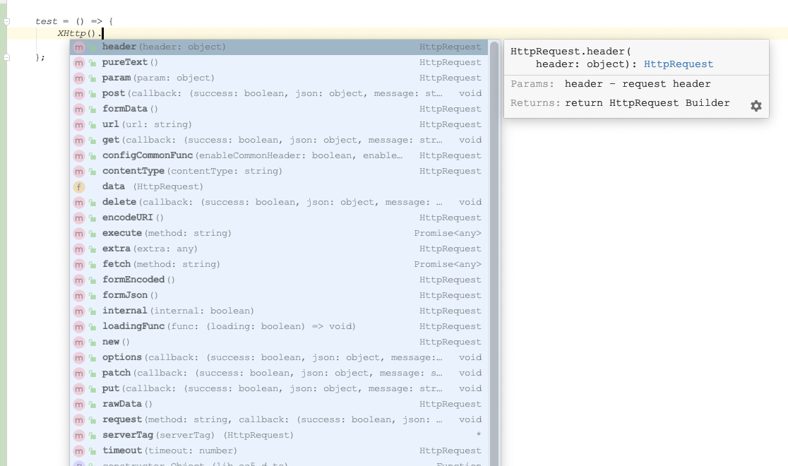 当然大家有没有发现,在使用这些库方法的时候,代码有提示呢?那就对了。因为我为主要的方法增加了dts描述文档,所以在写代码过程中,如果不记得方法名参数直接通过代码自动提示来写就行了(自动提示在webStorm上的体验更好):