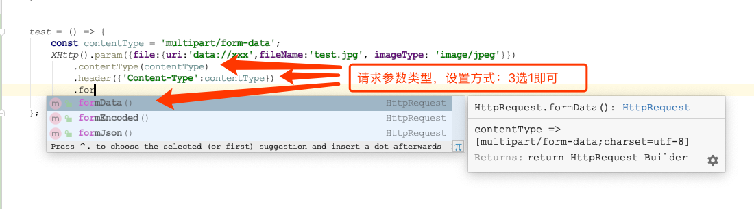 - 当然并不只是简单的传个参数而已,必须能根据请求contentType按正常的方式处理body,如果contentType若为multipart/form-data,则使用FormData去接收拼接开发者传入的参数