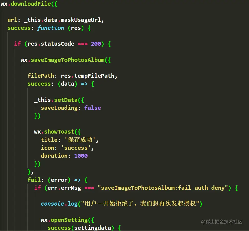 微信小程序保存图片到本地相册 前端格局 2020-03-17 2,496 阅读1分钟 注意:微信小程序保存图片到本地需要在开放者平台配置相关权限方可在真机上调用接口,或者,本地调试,打开“开发者调试”vConsole“,就可以实现保存了。 部分代码截图: 附源码github链接: github.com/monaGeju/Bl…
