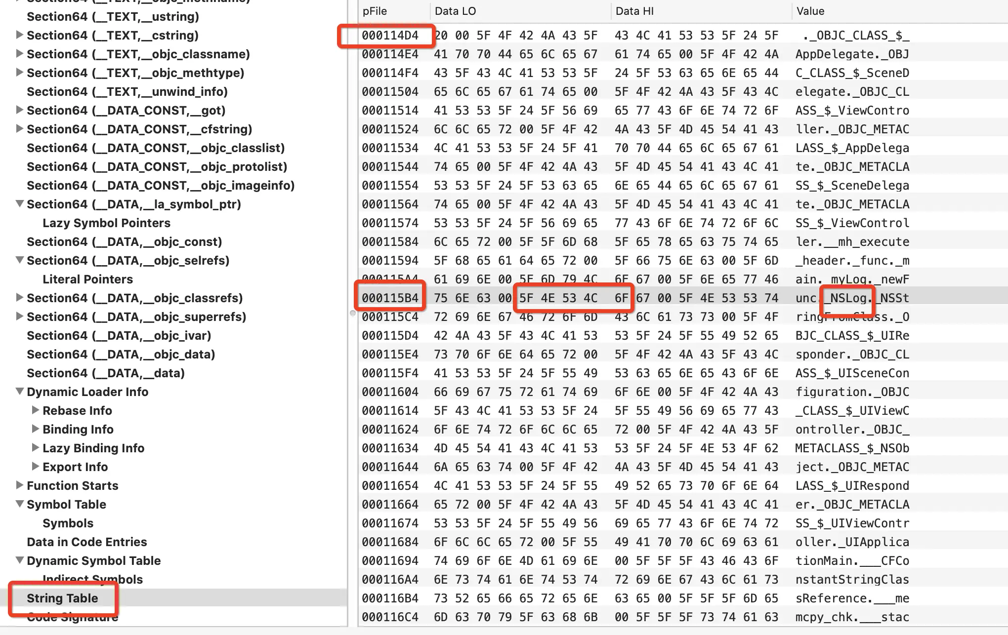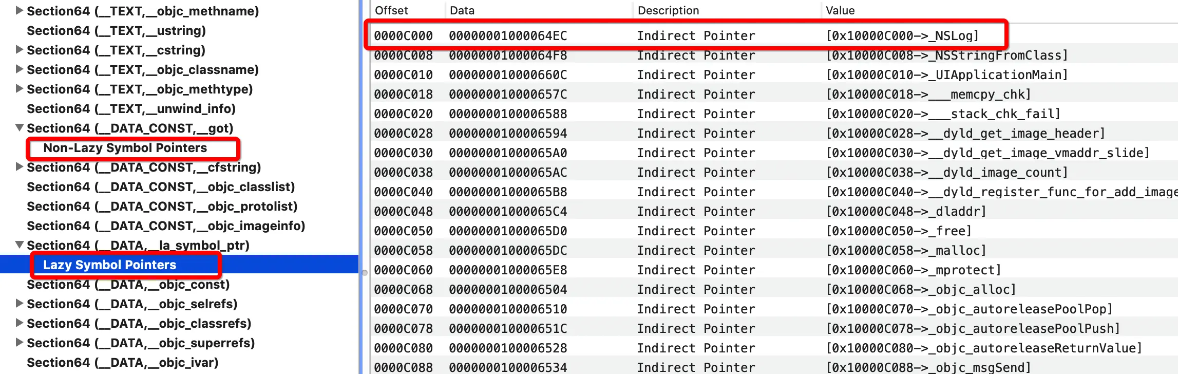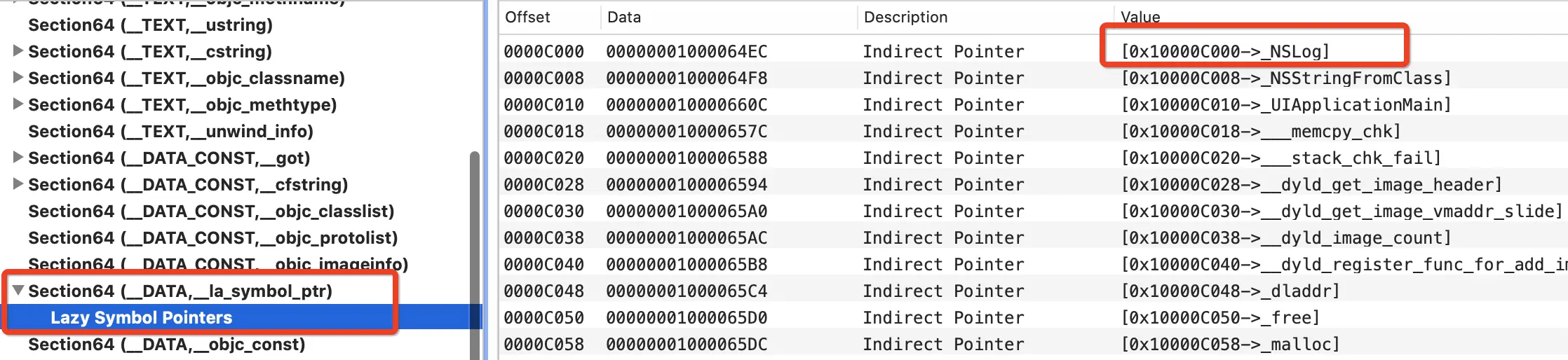 - 通过 MachOView 查看 MachO 文件的 Lazy Symbol Pointers 找到NSLog
