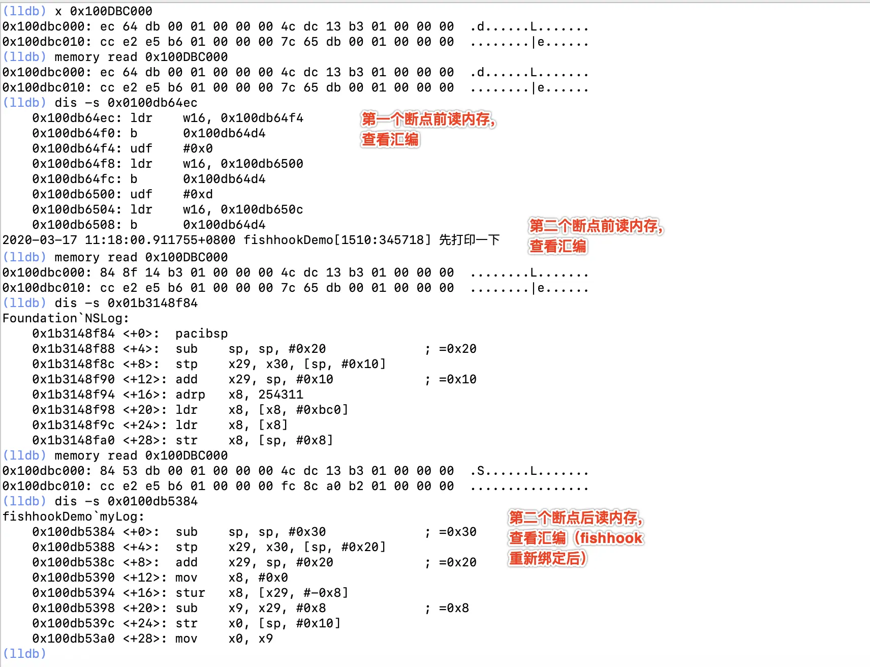 结论: 在第一个断点前,查看内存是乱数据,当执行完第一个断点后就看到了系统的Foundation 框架的 NSLog 所以说明 NSLog 是懒加载形式的绑定,所以存在于MachO文件里面的Lazy Symbol Pointer 里。在使用的时候dyld继续符号的绑定。在执行完fishhook的重新绑定后,读这个偏移量的内存已经替换成了我们自己的myLog。从而得知fishhook对我们的符号进行了重新的绑定。