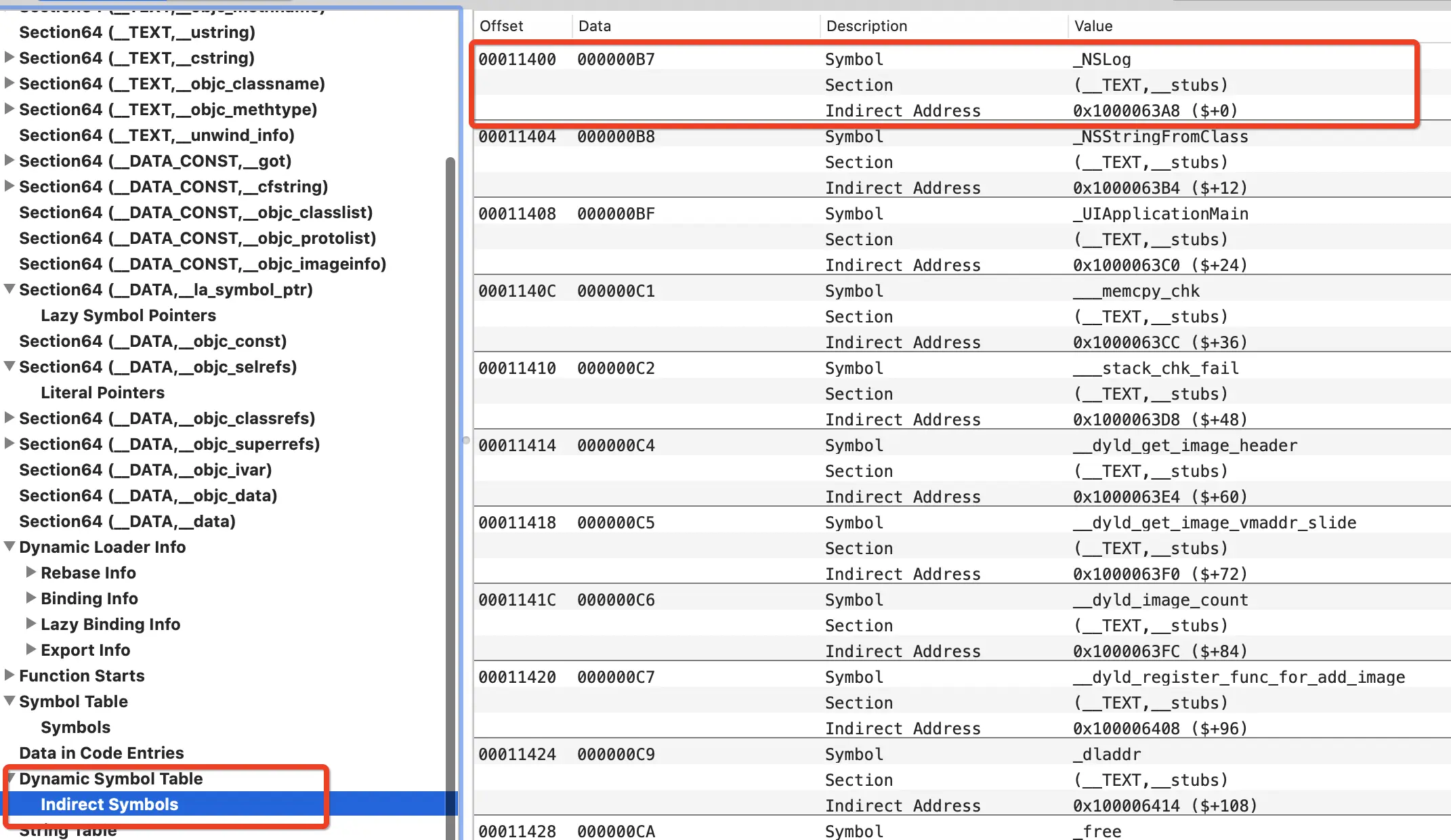 - 上面NSLog对应 Dynamic Symbol Table 里面NSLog的位置(这里都是第一个)