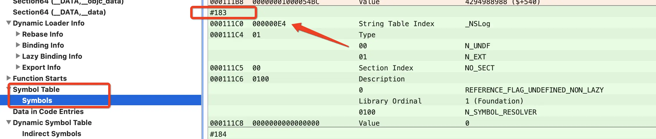 - 根据 Dynamic Symbol Table NSLog Data段的内容(这里是000000B7)换算成10进制就是183 去 Symbol Table 里面找到编号是#183的符号,也就找到了偏移地址(箭头所示):000000E4