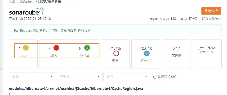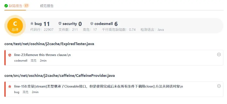 当开发人员想要对以前的代码进行错误检查时,可以选择进行全量扫描。全量扫描时,用户可以直接选择某个分支直接进行扫描操作并产出报告。报告中包含了缺陷报告及规范报告,在缺陷报告中,Gitee Scan 会通过 Bug、安全漏洞以及代码异味三个类别将问题分类,方便开发人员有针对性的修改。
