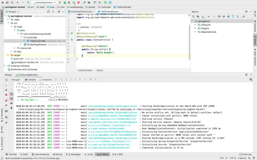 为了更进一步加深对上述概念的理解,这里以一个Spring Boot应用为例演示如何通过Docker部署一个Spring Boot服务。这里可以通过IDE创建一个简单的Spring Boot应用并写一个测试接口,如下图所示: