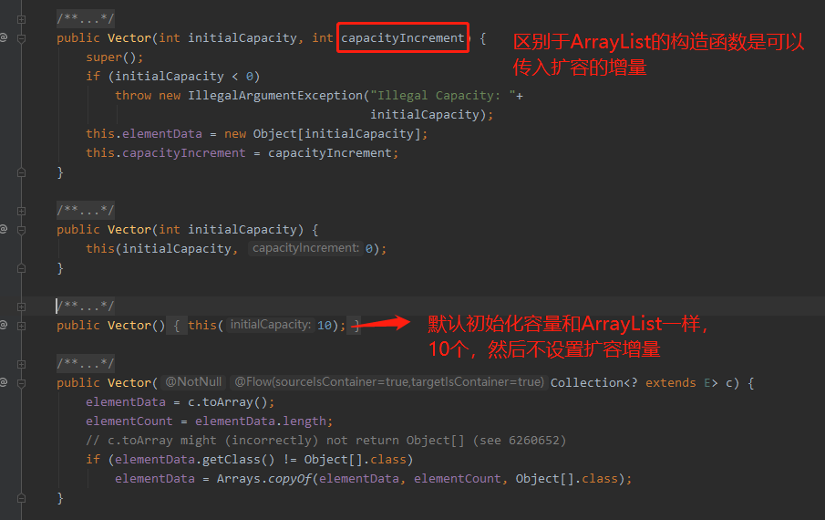 从类的初始化代码可以看出,ArrayList和Vector的数据结构基本一致,初始化容量大小都是10,不同的是Vector的构造函数还可以传递扩容增量(即下次扩容时数组容量扩大的单元数量)