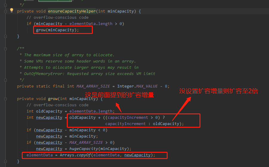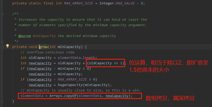 从源码中可以看出,ArrayList扩容时默认扩容为原来的1.5倍,且该数值无法自定义,而Vector则可以自定义扩容大小,不设置默认为原来的2倍,而对于数组的扩容,因为数组是无法动态变化其容量的,底层都是使用了深拷贝,即new一个新的数组并复制原数组过来,所以比较消耗性能。所以对于需要经常进行插入操作的数据,在使用ArrayList和Vector时一定要设置好初始容量。