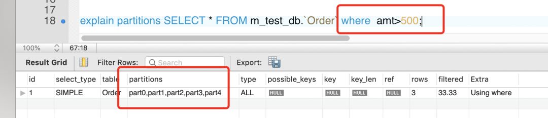 mysql> explain partitions select * from TxnList where startTime>'2016-08-25 00:00:00' and startTime<'2016-08-25 23:59:00'; +----+-------------+-------------------+------------+------+---------------+------+---------+------+-------+-------------+ | id | select_type | table | partitions | type | possible_keys | key | key_len | ref | rows | Extra | +----+-------------+-------------------+------------+------+---------------+------+---------+------+-------+-------------+ | 1 | SIMPLE | ClientActionTrack | p20160825 | ALL | NULL | NULL | NULL | NULL | 33868 | Using where | +----+-------------+-------------------+------------+------+---------------+------+---------+------+-------+-------------+ 1 row in set (0.00 sec)