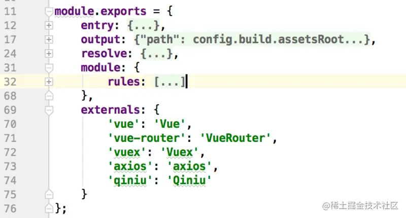 即在 build/webpack.base.conf.js⽂文件的module⾥里里⾯面与rules同层加⼊入 externals: