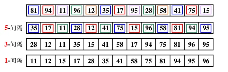 对给定的数组以间隔进行排序,即先以比较大的间隔对数组进行排序,然后逐渐缩小间隔,直达间隔为1。