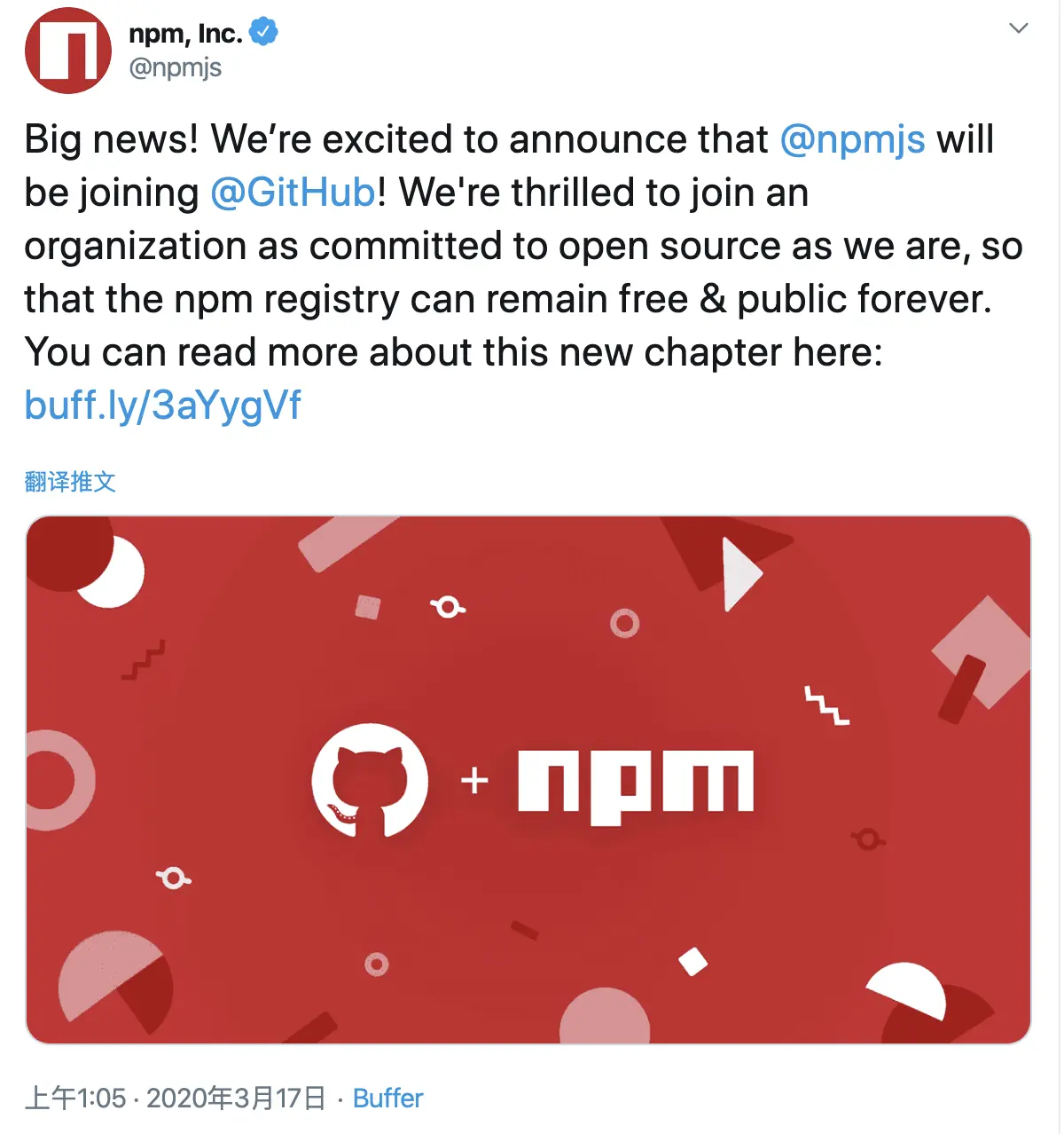 Nat Friedman(GitHub CEO)宣布 GitHub 已签署收购 npm 的协议,并表示 npm 加入 GitHub 后会继续免费提供 public registry 服务。