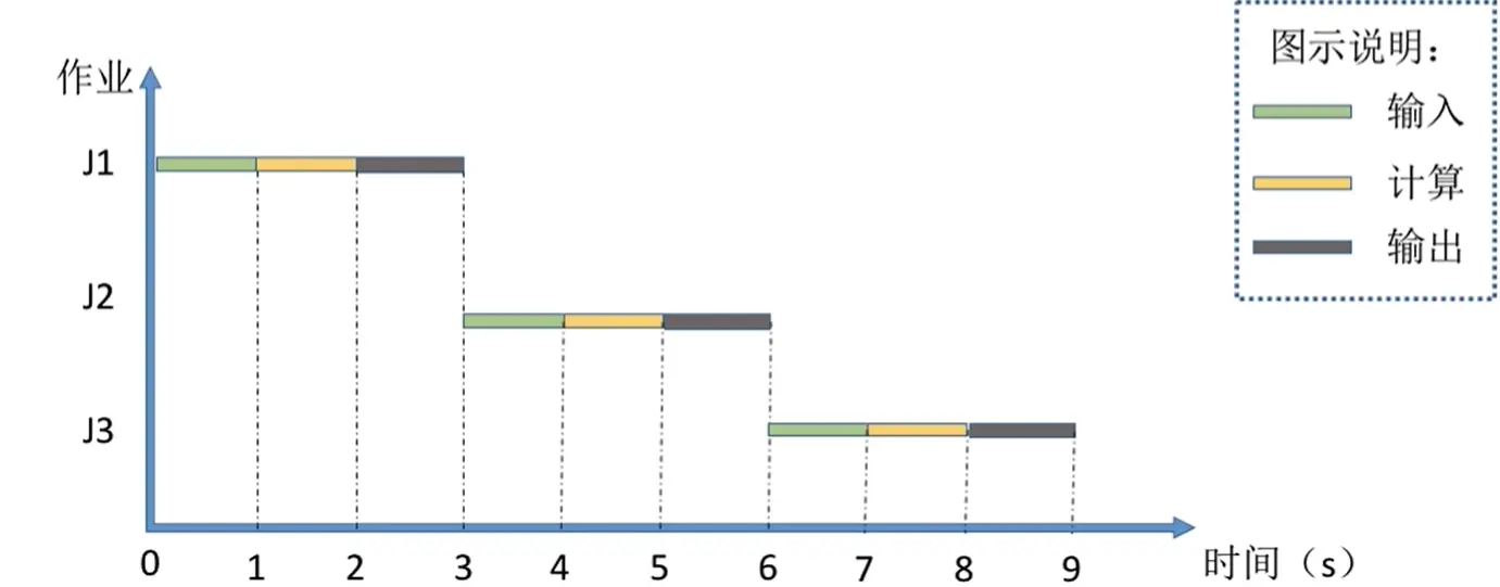 假如计算机现在需要处理 J1,J2,J3 三个作业,每个作业都需要经历输入(1秒)、计算(1秒)、输出(1秒)的过程。
