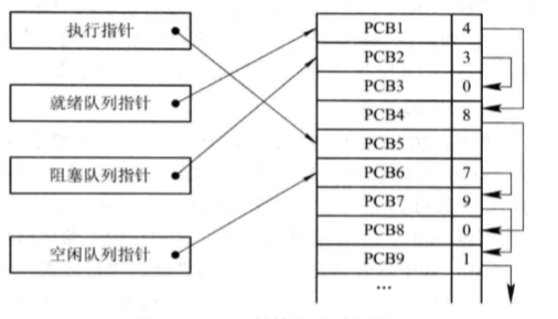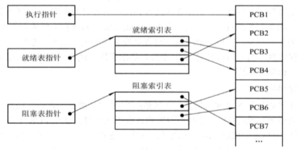 按照进程状态建立几张索引表,OS 持有指向各个索引表的指针(执行指针、就绪表指针、阻塞表指针)