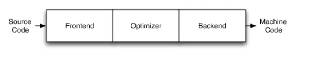 Frontend:编译器前端,负责解析源代码。用于词法分析、语法分析、语义分析、检查代码的语法错误、构建抽象语法树AST(Abstract Syntax Tree)。Optimizer:优化器,负责优化代码。如消除冗余等。Backend:后端,负责生成机器代码。将代码映射到对应的指令集,并负责生成相关的代码,并且优化。