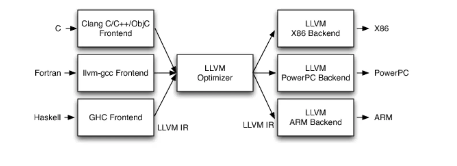当编译器需要支持多种语言或者多种硬件架构的时候,LLVM的强大之处就体现出来了。普通的编译器都是作为整体应用程序来编写的,只能对单语言进行支持。而LLVM最核心之处就是使用通用的代码表示形式IR(intermediate representation),即不同的前端语言最终都转换成同一种IR,让其可以为任何语言编写前端、为任何硬件编写后端。