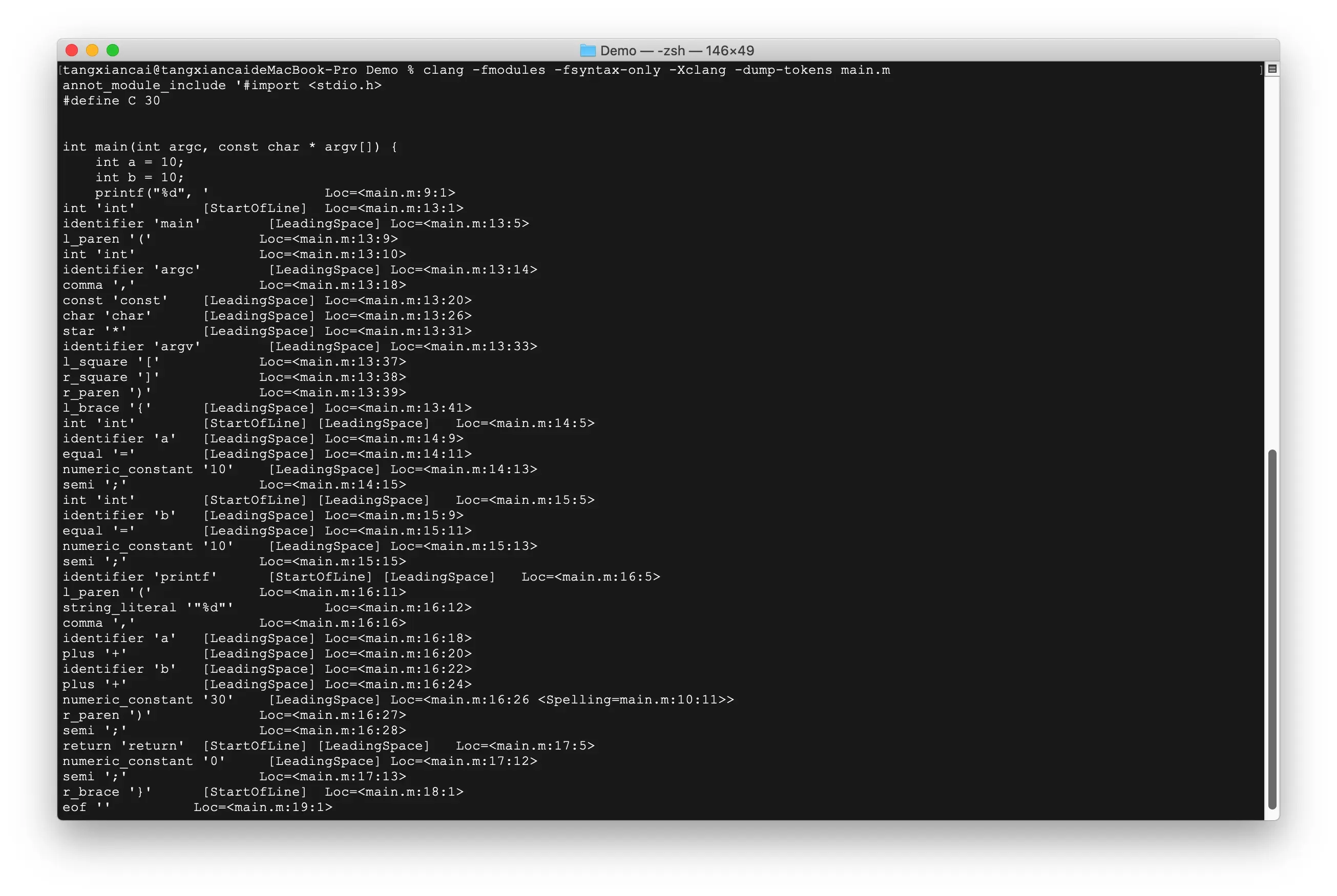 clang -fmodules -fsyntax-only -Xclang -dump-tokens main.m