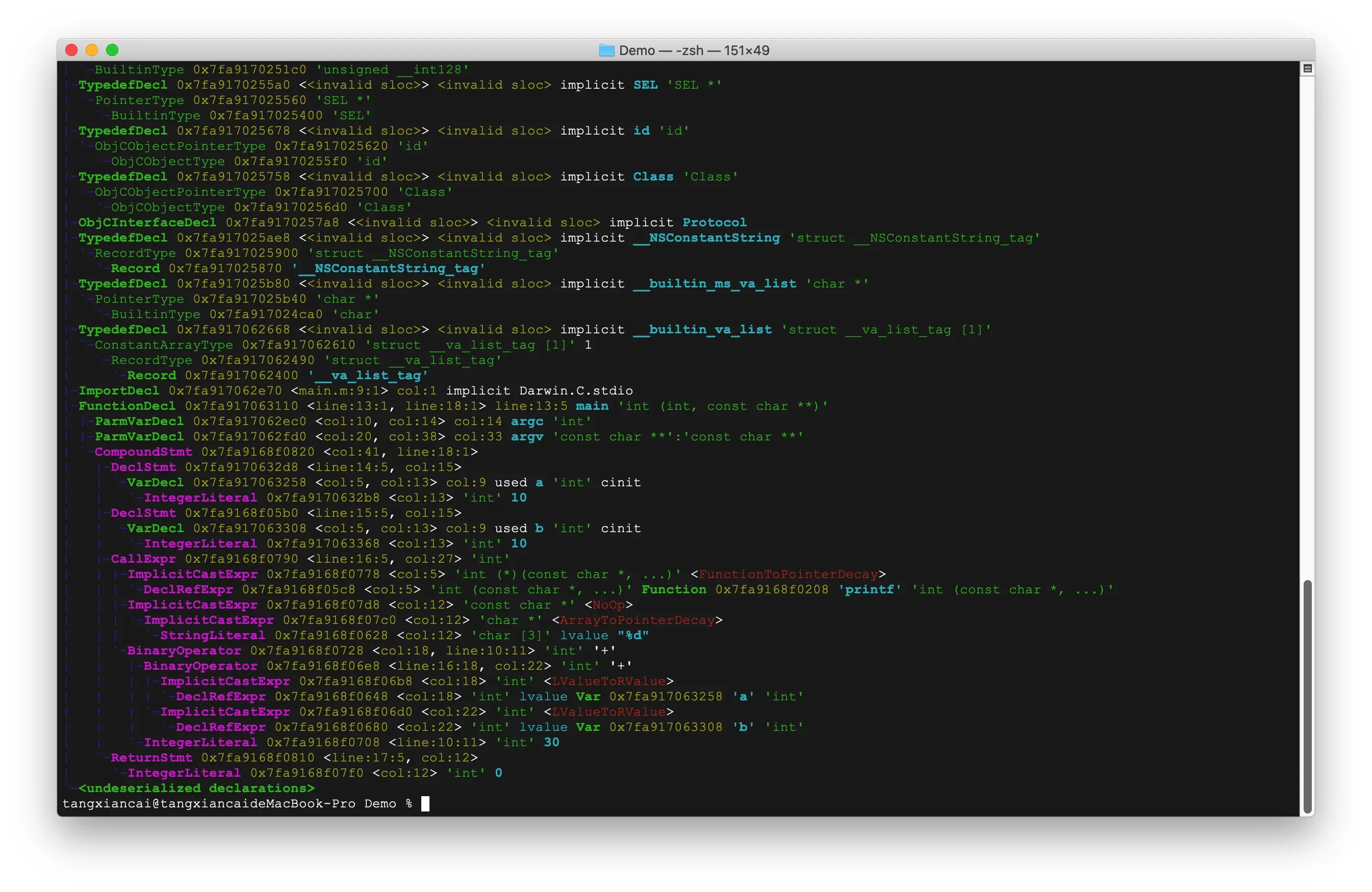结合原来的代码,可以看出FunctionDecl这就是main函数的标识,说明从13行第1个字符到18行第1个字符就是main函数。DeclStmt就是参数节点。CallExpr是调用函数的返回值,ImplicitCastExpr是函数的参数指针,BinaryOperator是运算符。ReturnStmt则是返回值。