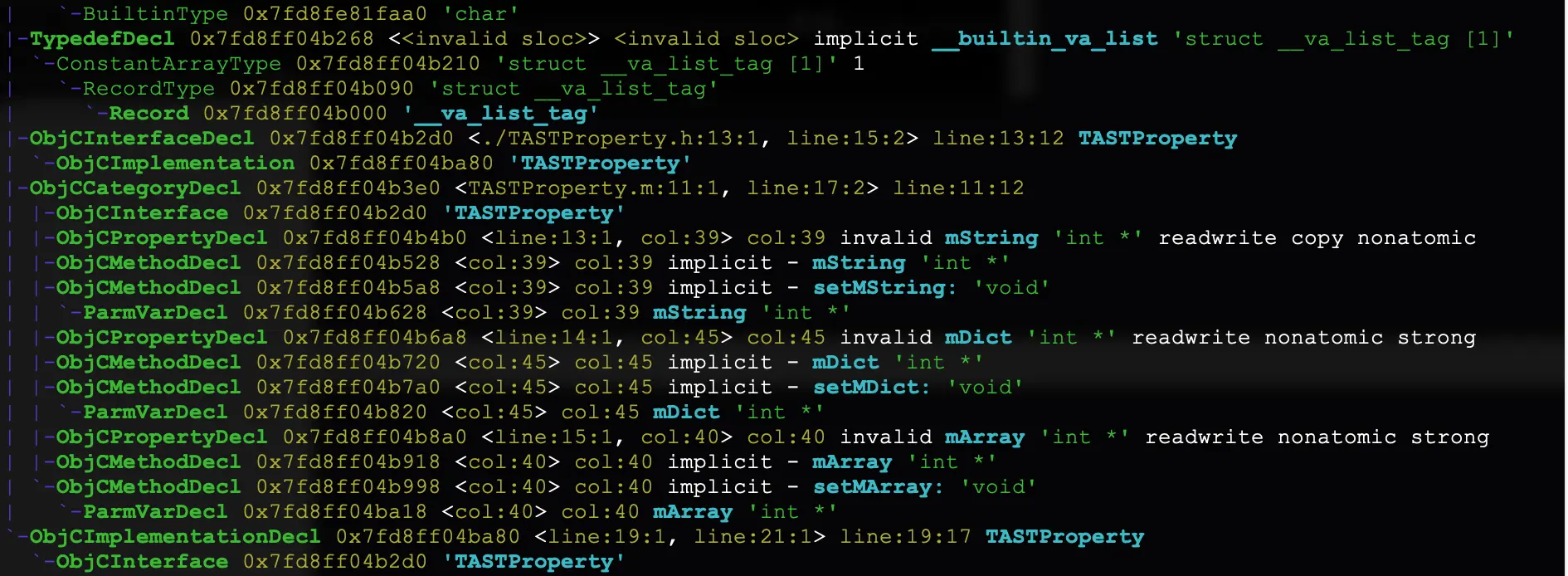 可以清楚的看到,ObjCPropertyDecl就是我们需要的语法树的节点,而且定义的属性都能看到其对应的修饰词。所以我们可以读取到语法树的节点,根据节点信息来做判断。