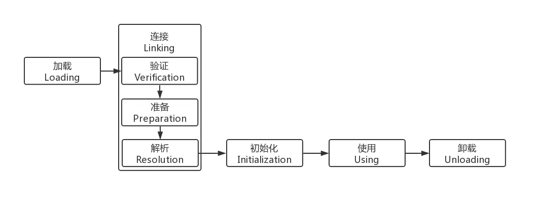 一个类型从被加载到虚拟机内存中开始,到卸载出内存为止,它的整个生命周期将会经历加载(Loading)、验证(Verification)、准备(Preparation)、解析(Resolution)、初始化(Initialization)、使用(Using)和卸载(Unloading)七个阶段,其中验证、准备、解析三个部分统称为连接(Linking)。