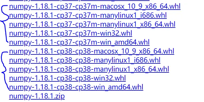 其实,维护软件包在不同操作系统的版本,并不少见。如果你曾留意过不同版本 Python 库文件的话,你会注意到很多库都会按不同操作系统而分发不同的版本。例如,下面是同一版本号的 Numpy 在不同操作系统上的分发版(pypi.org/simple/nump…):
