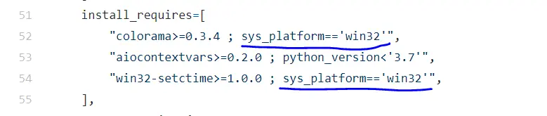 例如 colorama 库,如果我们只在 win32 系统才需要依赖,那么在打包时就可以指定:“colorama>=0.3.4 ; sys_platform=='win32' ”;如果不需要限定 win32 系统,而是在 windows 环境都安装,那么可以写成“colorama>=0.3.4 ; platform_system=='Windows' ”。