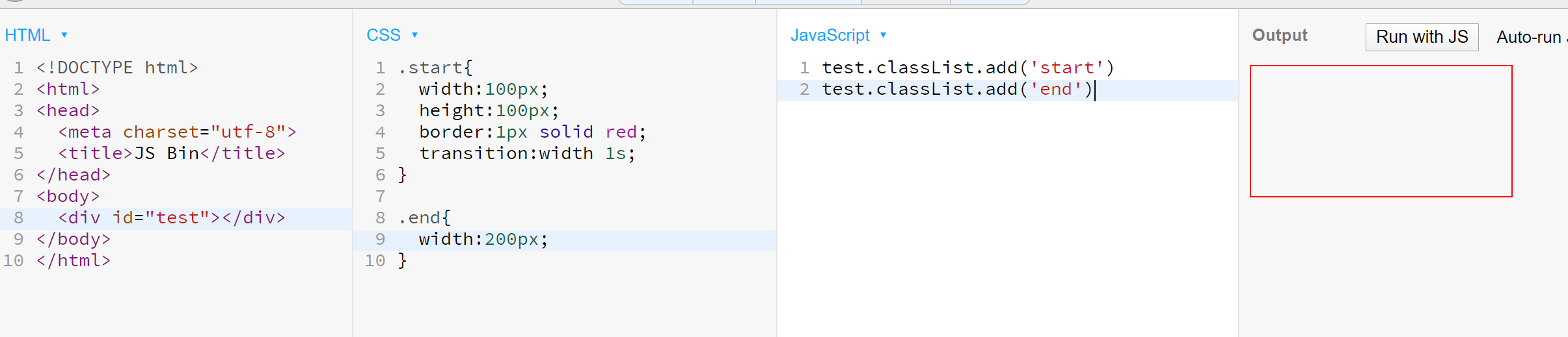 获取这个div的客户端宽度,就会出现动画了。获取宽度不会改变其他东西,但是会让浏览器先渲染第一步,先加一个start类,然后再获取宽度,再加end类,这样就不会合并了。