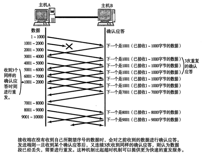 如果1001-2000这段丢失,那么服务端就会一直返回1001的确认应答,发送端如果在第一次收到该应答后又连续3次收到的都是1001的确认应答,则会重发1001-2000的报文。【所以是4次1001的确认应答】