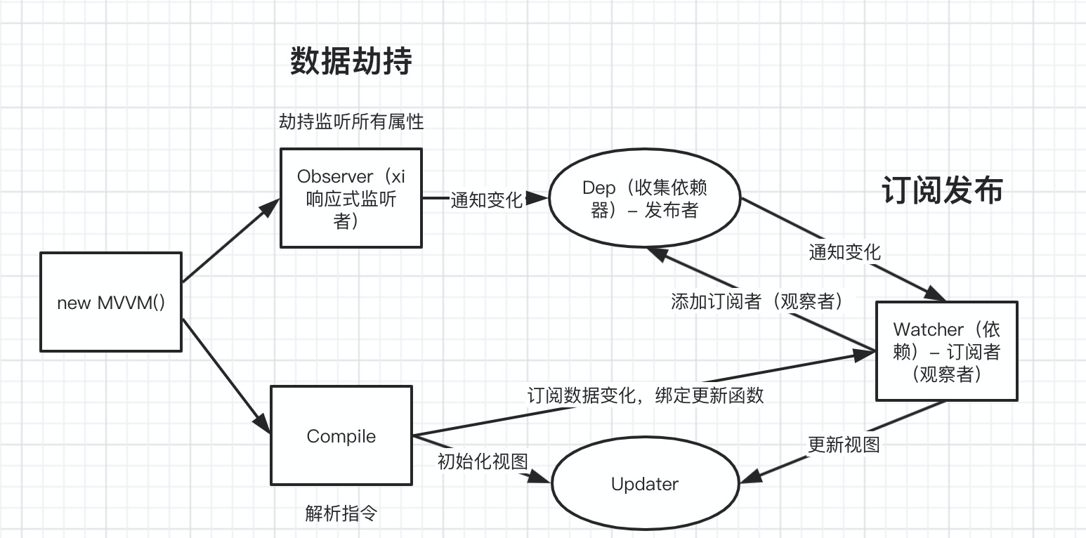 Vue是采用数据劫持,结合发布-订阅模式,通过Object.defineProperty来劫持各个属性的setter和getter,数据改变时,发布变化消息给Dep(发布者/依赖收集器),去听通知Watcher(订阅者/观察者)作出对应的回调去更新视图。