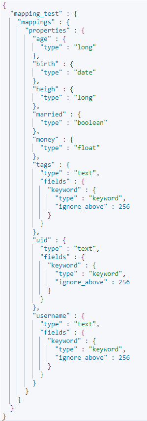 然后使用 GET /mapping_test/_mapping 查看,结果如下图所示: