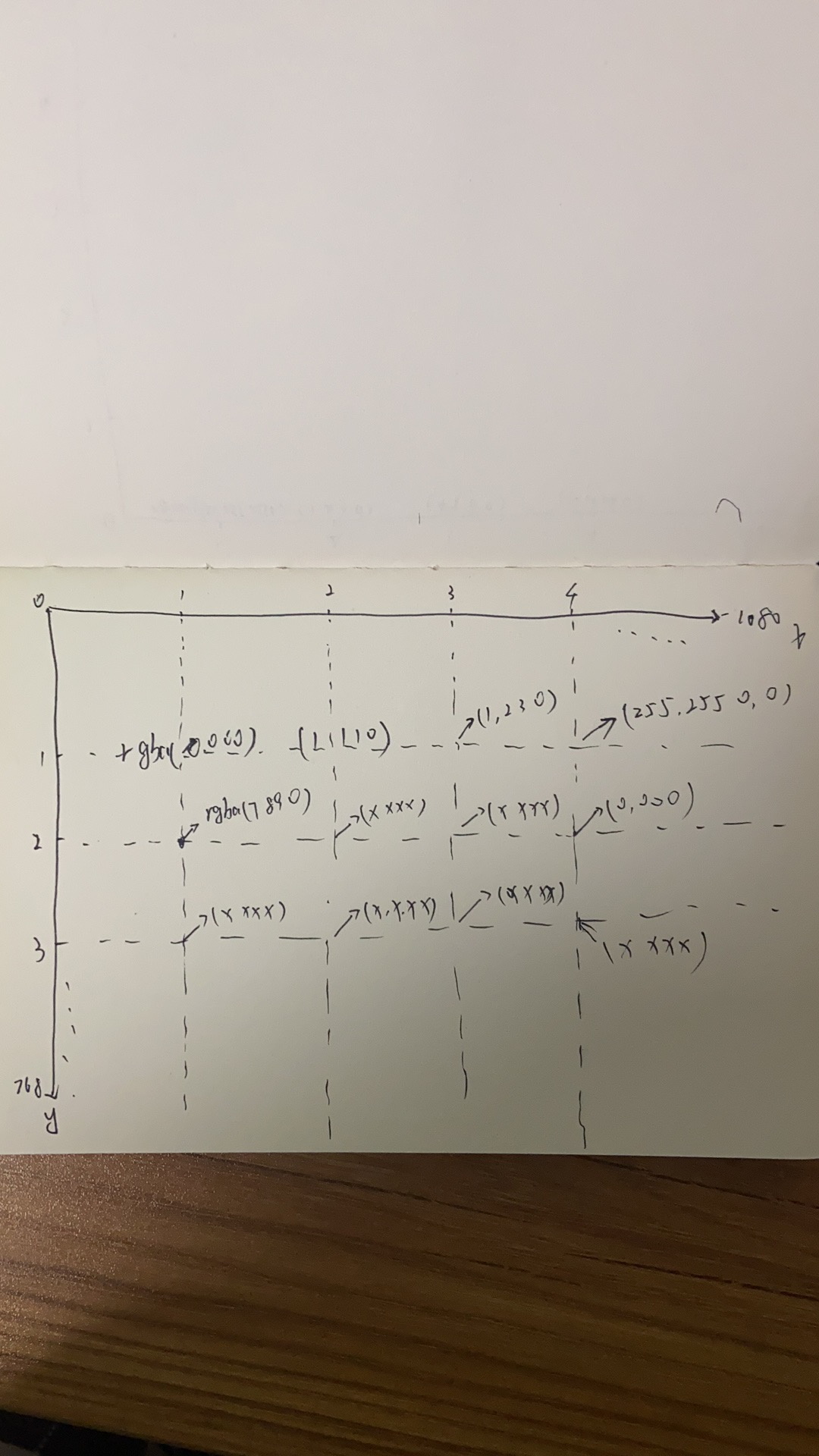 比如x轴(1,1)这个位置,需要用Uint8ClampedArray数组的前四位表示. x轴(2,1)这个位置,需要用Uint8ClampedArray索引4-7的元素表示。 那坐标(1,2)第一位对应表示Uint8ClampedArray索引就是(1080*(2-1) + (1-1)) * 4 -1 . 坐标(m,n)首位索引对应的就是(width*(n-1) + m-1)) * 4 -1。 不懂的观众姥爷可以慢慢品一下。~~~~~