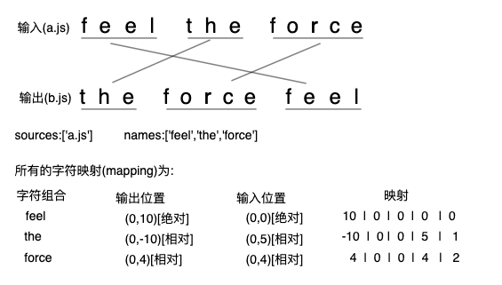 以the 为例,它在输出中的位置是(0,0),a.js 是sources 的第1个(这里只是举例),输入中的位置是(0,5), the是 names的第2个(这里只是举例)。