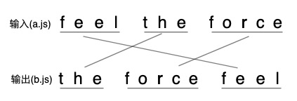 假设现在有a.js ,内容为feel the force ,处理后为b.js ,内容为the force feel