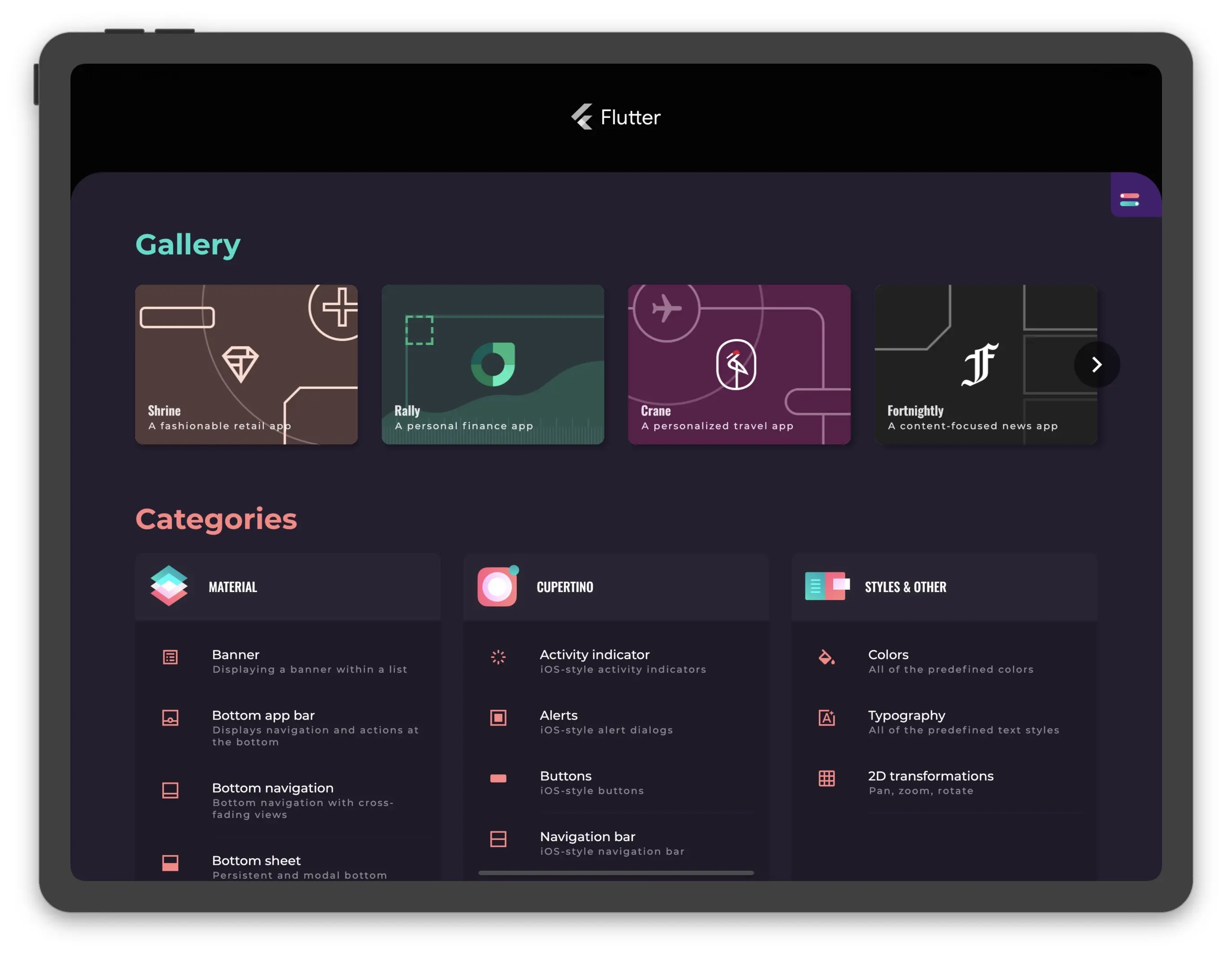 a resource to help developers evaluate and use Flutter. It is a collection of Material Design & Cupertino widgets, behaviors, and vignettes implemented with Flutter.