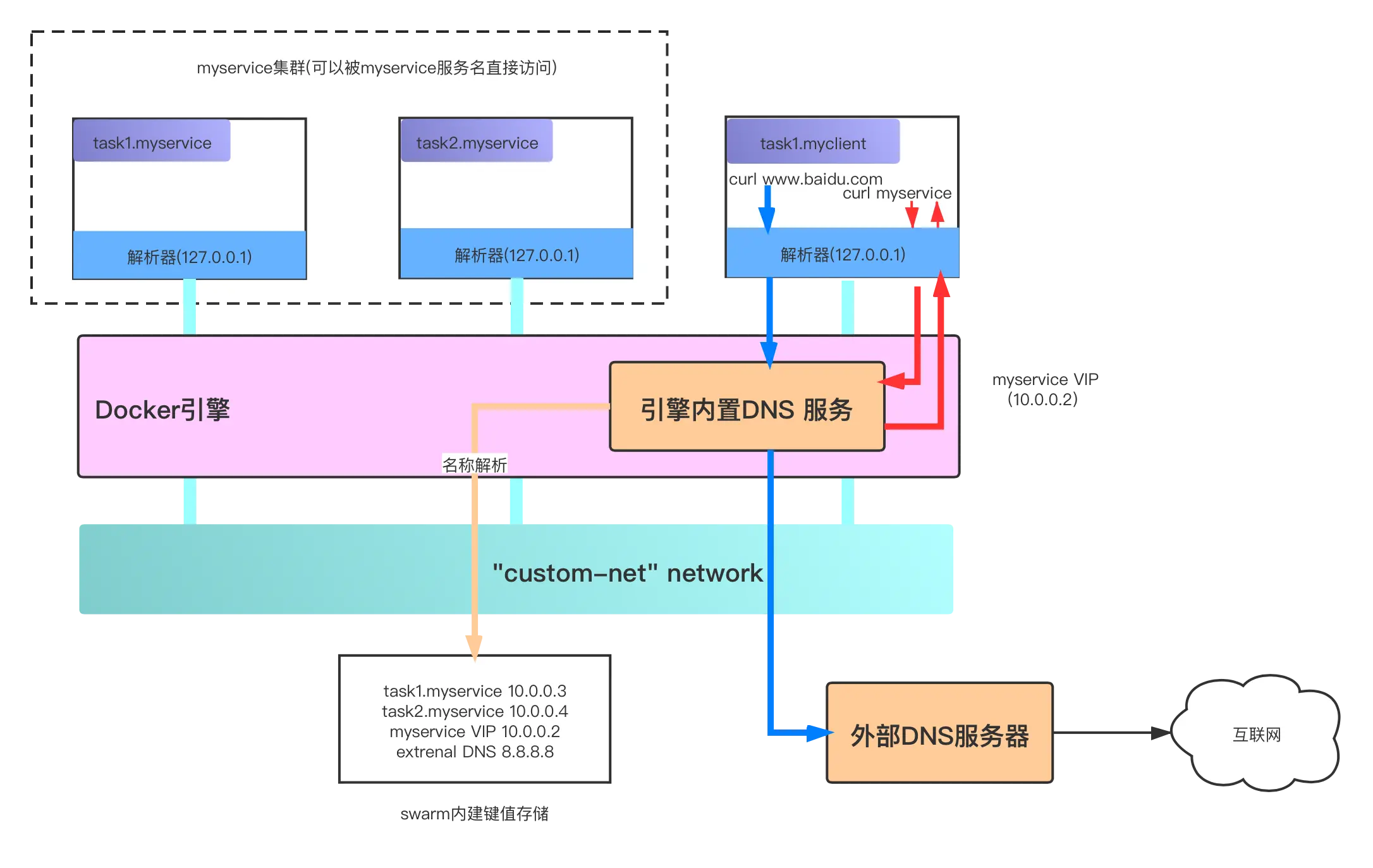 客户端myclient执行对myservice的curl请求,其实,它也是在对DNS进行请求。 容器内置的解析器将查询转发到Docker引擎的DNS服务器。 然后,对myservice的请求将解析为10.0.0.2虚拟IP,转发回客户端,客户端就可以通过虚拟ip去访问容器。