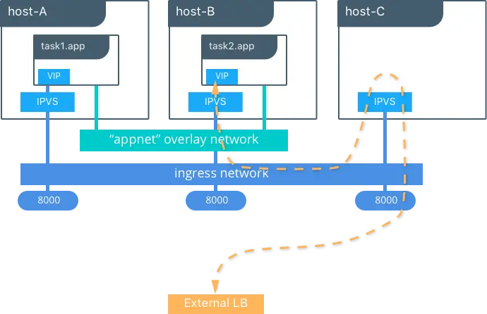 Overlay网络上创建了具有两个副本的服务。 我们可以看到该服务在三个节点上的8000端口上公开,此时,发往应用程序的流量可以转发到任何节点。 假设在这种情况下,有一个外部负载均衡器,它恰好将请求转发到唯一没有该服务实例的节点, 该请求由IPVS在第三个节点上处理和转发,该IPVS使用ingress网络并因此使用上述负载均衡方法将其重定向到该服务的集群上的其中一个真实运行的容器。