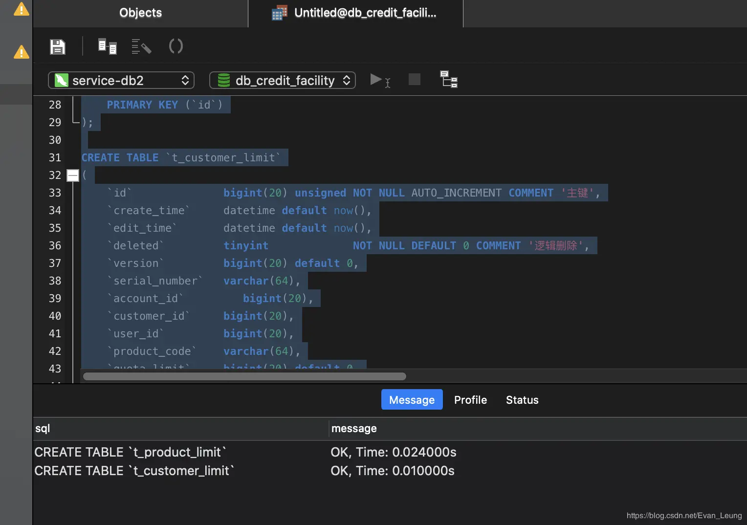 跟前面章节一样,因为额度服务对数据库有依赖,所以这里需要初始化额度服务用到的表,使用Mysql客户端,连接到数据库,把项目里resources/db的表创建语句放入执行,我这里用Navicat去连接,数据库连接是192.168.101.11:3306