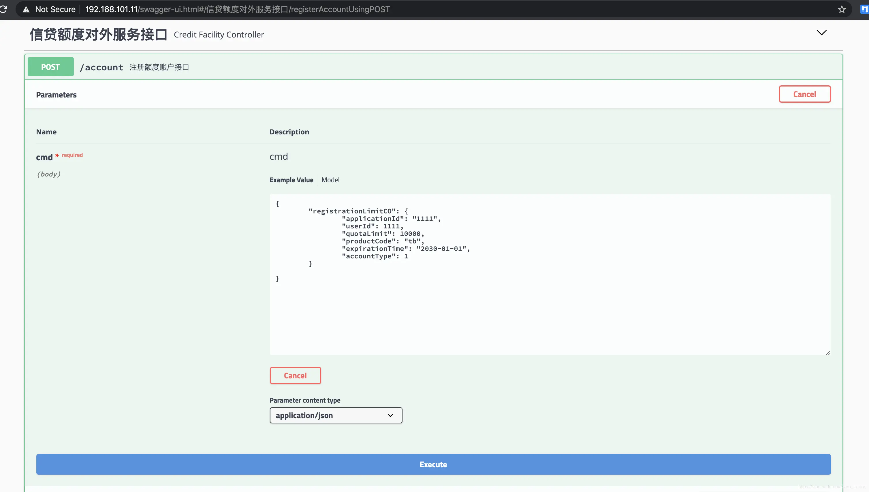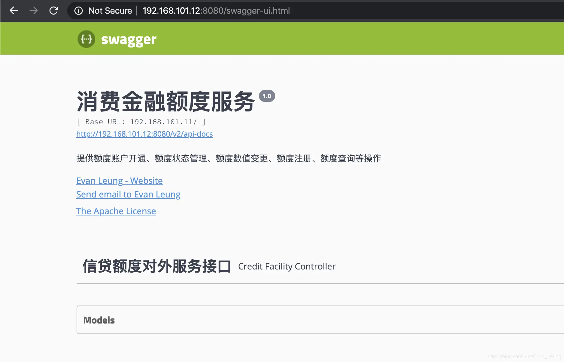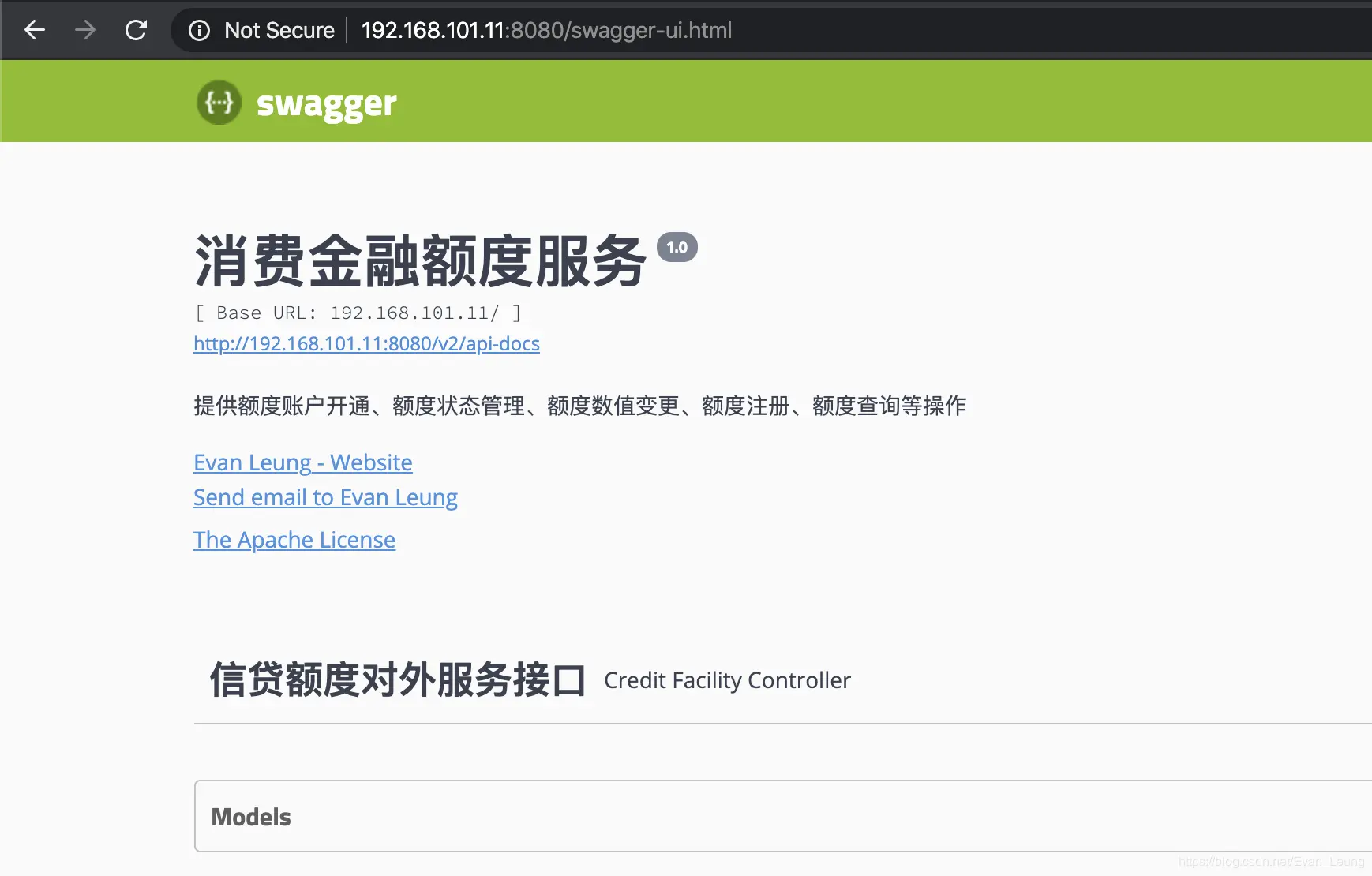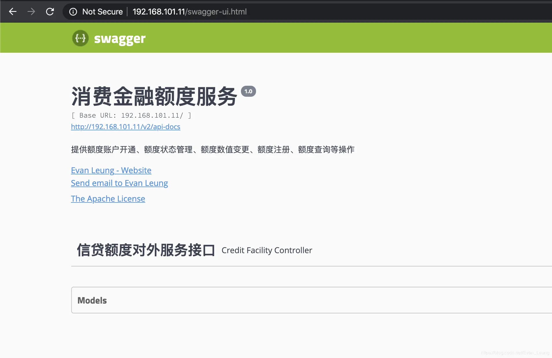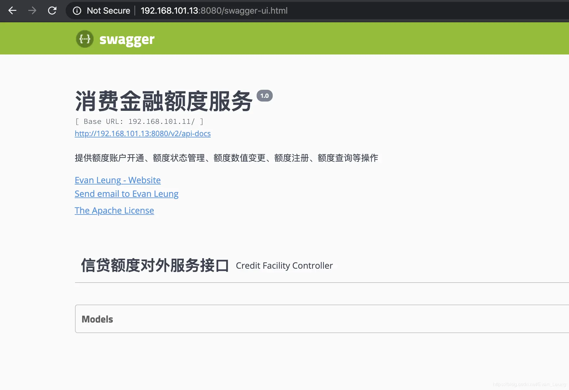 192.168.101.11http://192.168.101.11/swagger-ui.html可以访问到我们的额度服务 从上面可以看到,我们的Nginx已经起作用,成功代理我们的额度服务集群 - 验证额度服务每个节点 - 假如docker swarm正常运行,那么我们应该可以分别通过三个节点的
