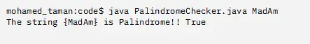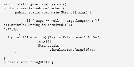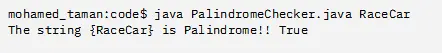 检查一段包含两个类的示例代码,以表明该代码将要检查以确定特定给定的字符串是否是回文。回文是从两个方向读取相同内容的单词,词组,数字或其他字符序列,例如“女士”或“赛车”。 这是保存在文件名中的代码PalindromeChecker.java: